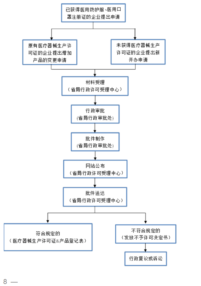 生产医用防护服、医用口罩的企业,应当按照《医疗器械注册管理办法》(国家食品药品监督管理总局令第4号)申请第二类医疗器械注册(流程图见附件1),按照《医疗器械生产监督管理办法》(国家食品药品监督管理总局令第7号)申请医疗器械生产许可证(流程图见附件2)。