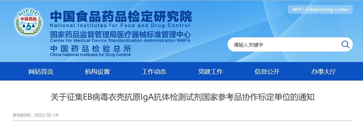 我单位正开展EB 病毒衣壳抗原 IgA 抗体国家参考品的换批研制工作,现邀请已经获得EB 病毒衣壳抗原 IgA 抗体诊断试剂注册证、或正进行EB 病毒衣壳抗原 IgA 抗体诊断试剂研发的企业参与标定工作。请有意向的境内上述企业或境外企业的中国代理人于2022年02月28日前报名参加,具体信息请填写报名调研表(见附件)。