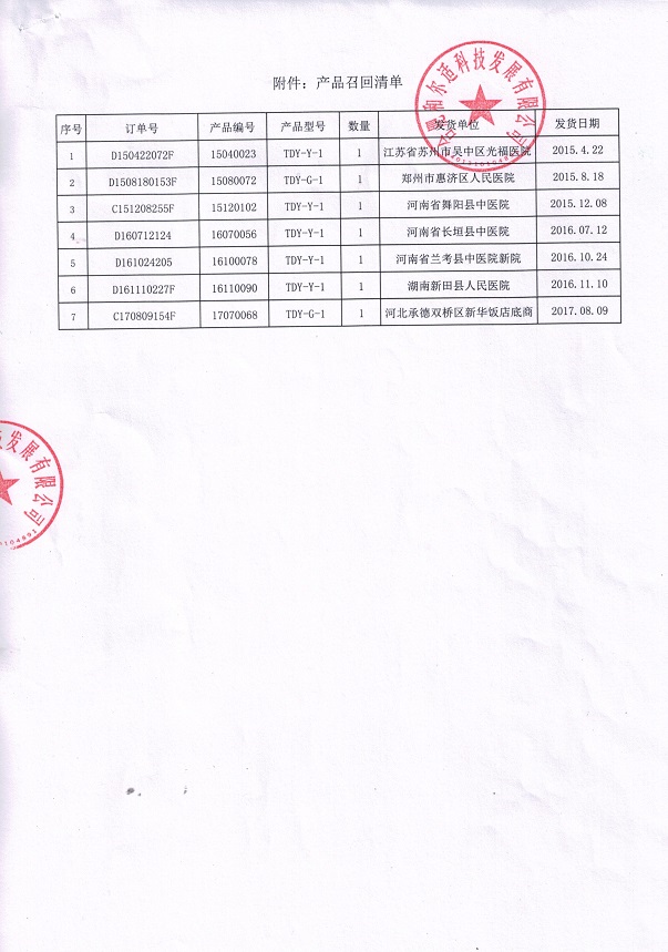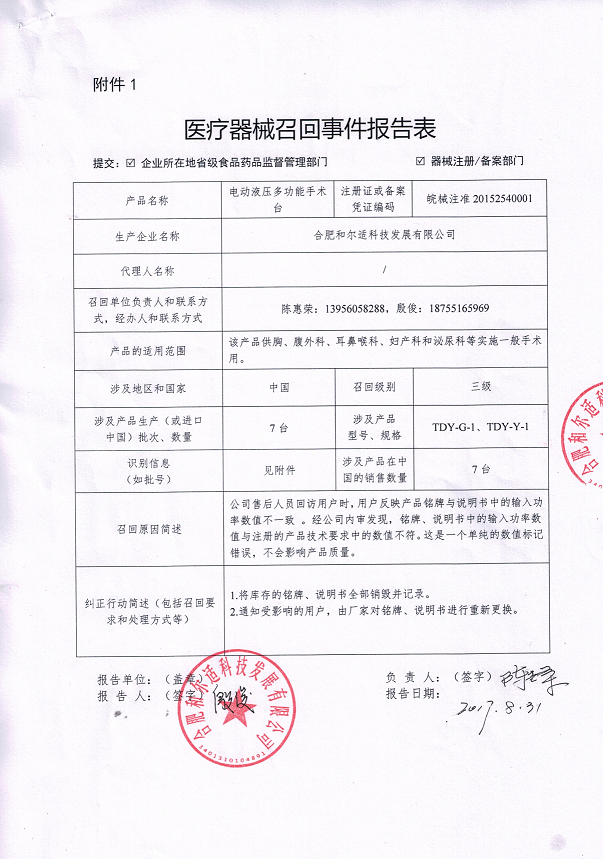 合肥和尔适科技发展有限公司报告,由于“铭牌、说明书中的输入功率数值与注册的产品技术要求中的数值不符”原因,合肥和尔适科技发展有限公司对其生产的电动液压多功能手术台(注册证号:皖械注准20152540001)主动召回。召回级别为三级召回。涉及产品的型号、规格及批次等详细信息见《医疗器械召回事件报告表》。
