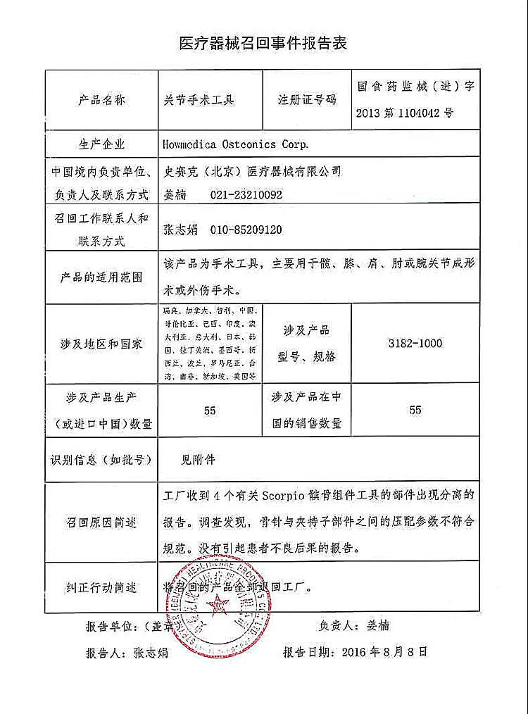 Howmedica Osteonics Corp.对关节手术工具主动召回