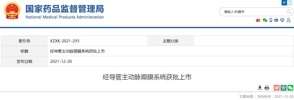 近日,国家药品监督管理局经审查,批准了美敦力公司MEDTRONIC INC.生产的创新产品“经导管主动脉瓣膜系统”注册。