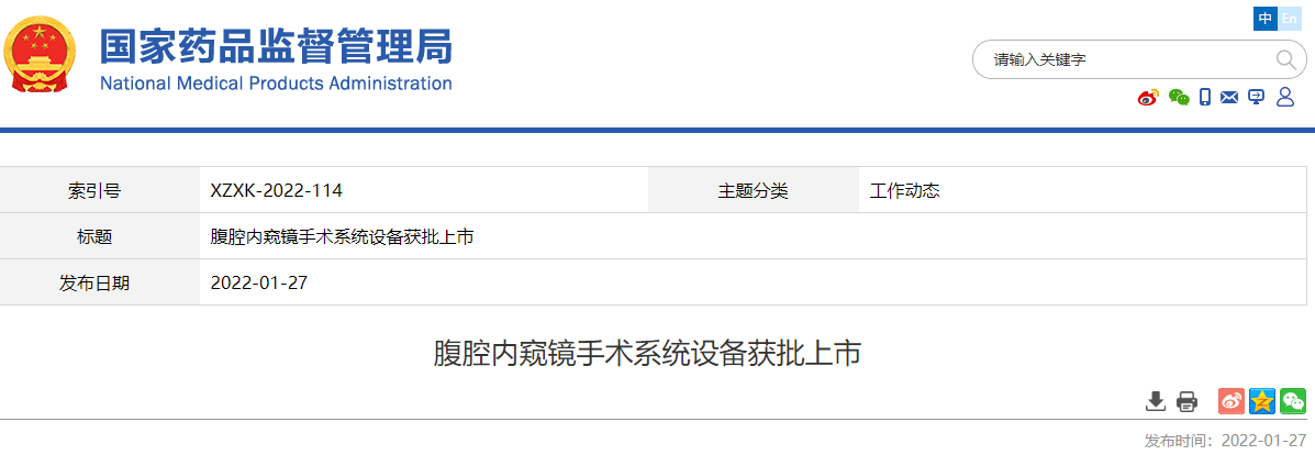 近日,国家药品监督管理局经审查,批准了上海微创医疗机器人(集团)股份有限公司生产的创新产品“腹腔内窥镜手术系统”的注册申请。
