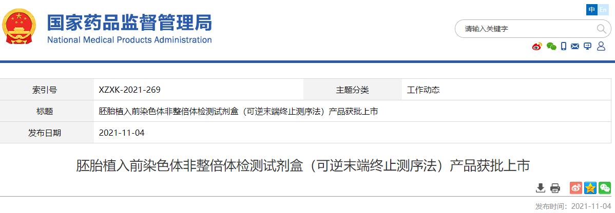 近日,国家药品监督管理局经审查,批准了北京中仪康卫医疗器械有限公司生产的创新产品“胚胎植入前染色体非整倍体检测试剂盒(可逆末端终止测序法)”的注册申请。