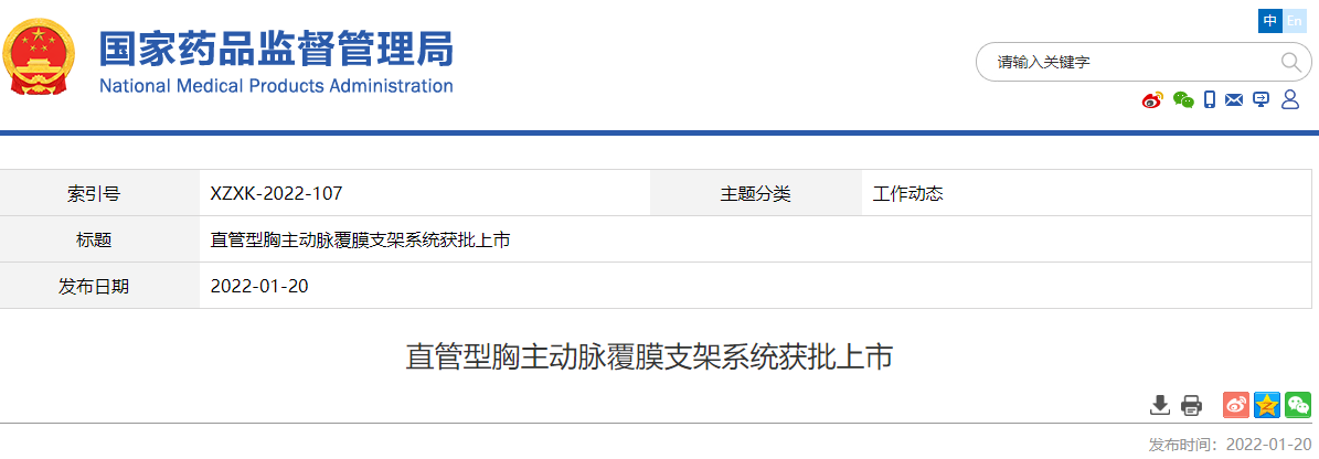 近日,国家药品监督管理局经审查,批准了上海微创心脉医疗科技(集团)股份有限公司生产的创新产品“直管型胸主动脉覆膜支架系统”注册。