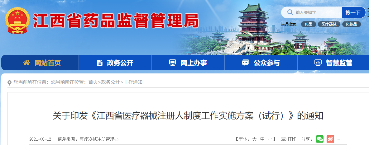 《江西省医疗器械注册人制度工作实施方案(试行)》已经2021年第5次局长办公会议审议通过,现予以印发,请各地、各单位认真执行。在执行中存在的有关情况报医疗器械注册管理处。