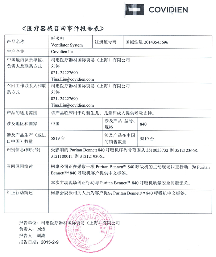柯惠医疗器材国际贸易(上海)有限公司报告:公司正在采取一项主动召回措施,为Puritan Bennett 840呼吸机客户提供中文标签。涉及产品的型号、规格及批次等详细信息见《医疗器械召回事件报告表》。