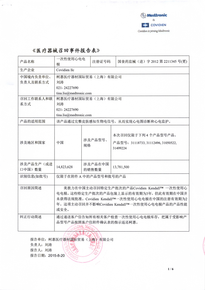 柯惠医疗器材国际贸易(上海)有限公司报告:公司已确定,一次性使用心电电极贴错了标签,将中国注册规定的“有效期2年”误贴为“有效期3年”。公司主动召回相关产品,召回级别为III级 。涉及产品的型号、规格及批次等详细信息见《医疗器械召回事件报告表》。柯惠医疗器材国际贸易(上海)有限公司对一次性使用心电电极主动召回