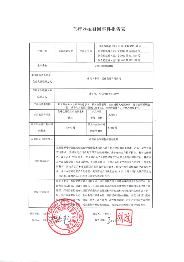 库克(中国)医疗贸易有限公司对血管造影导管主动召回