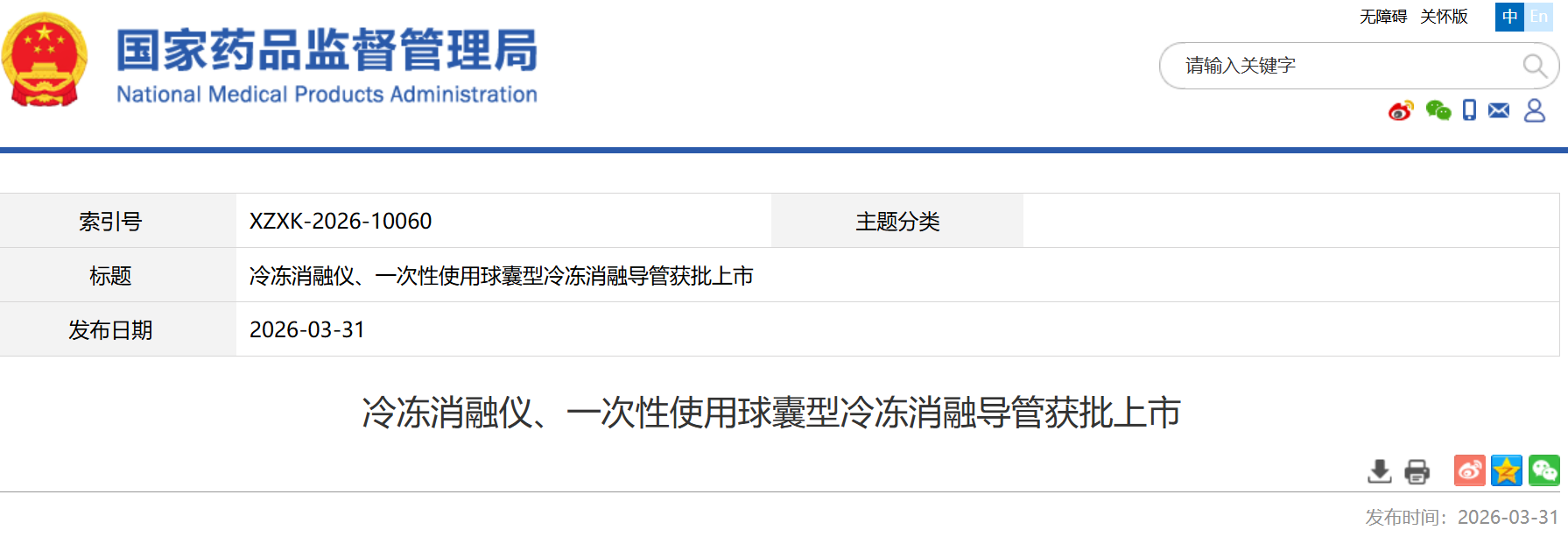 近日,国家药品监督管理局批准了心诺普医疗技术(北京)有限公司的冷冻消融仪、一次性使用球囊型冷冻消融导管注册申请。