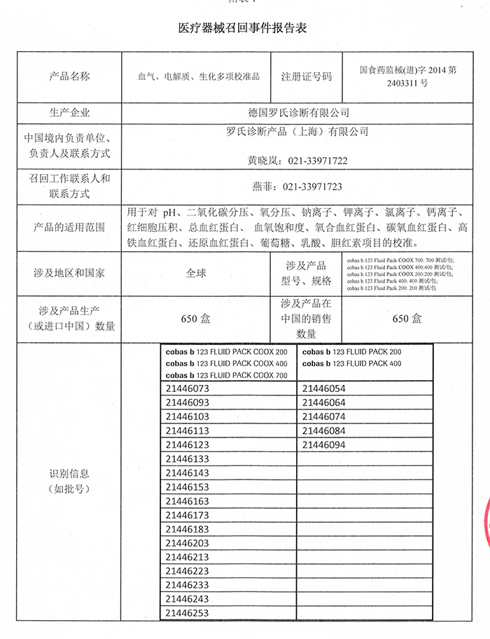 罗氏诊断产品(上海)有限公司对血气、电解质、生化多项校准品主动召回