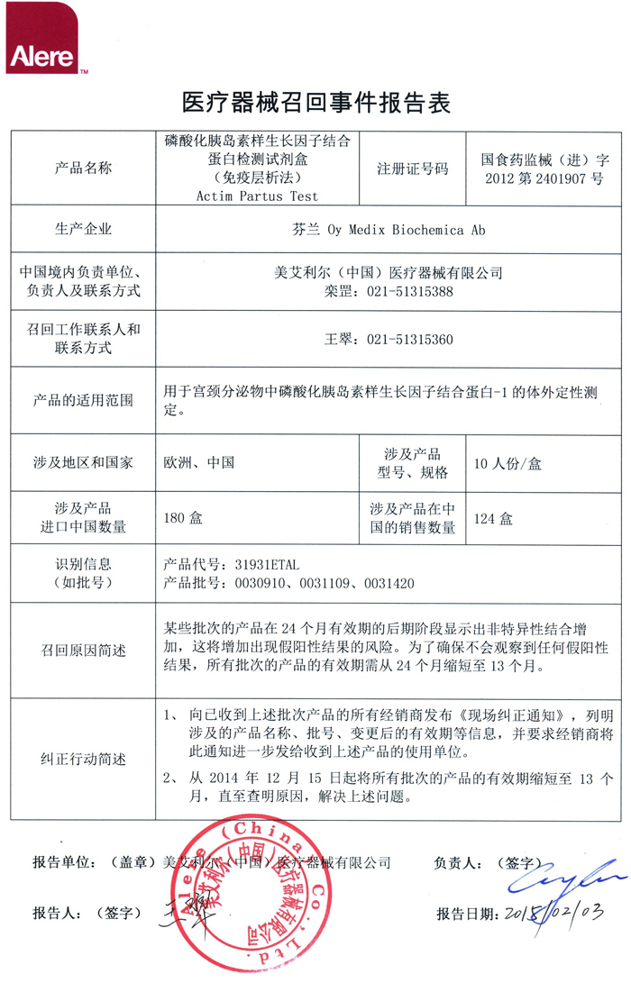 美艾利尔(中国)医疗器械有限公司报告:某些批次的产品在24个月有效期后期阶段显示出非特异性结合增加,这将增加假阳性结果发生概率,产品阳性结果表明患者早产风险增加,假阳性结果不会对患者造成伤害,但会使患者受到更多监护。Oy Medix Biochemica Ab主动召回相关产品。本次召回级别为III级。涉及产品的型号、规格及批次等详细信息见《医疗器械召回事件报告表》。