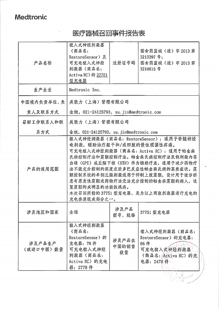 美敦力(上海)管理有限公司对植入式神经刺激器、可充电植入式神经刺激器主动召回