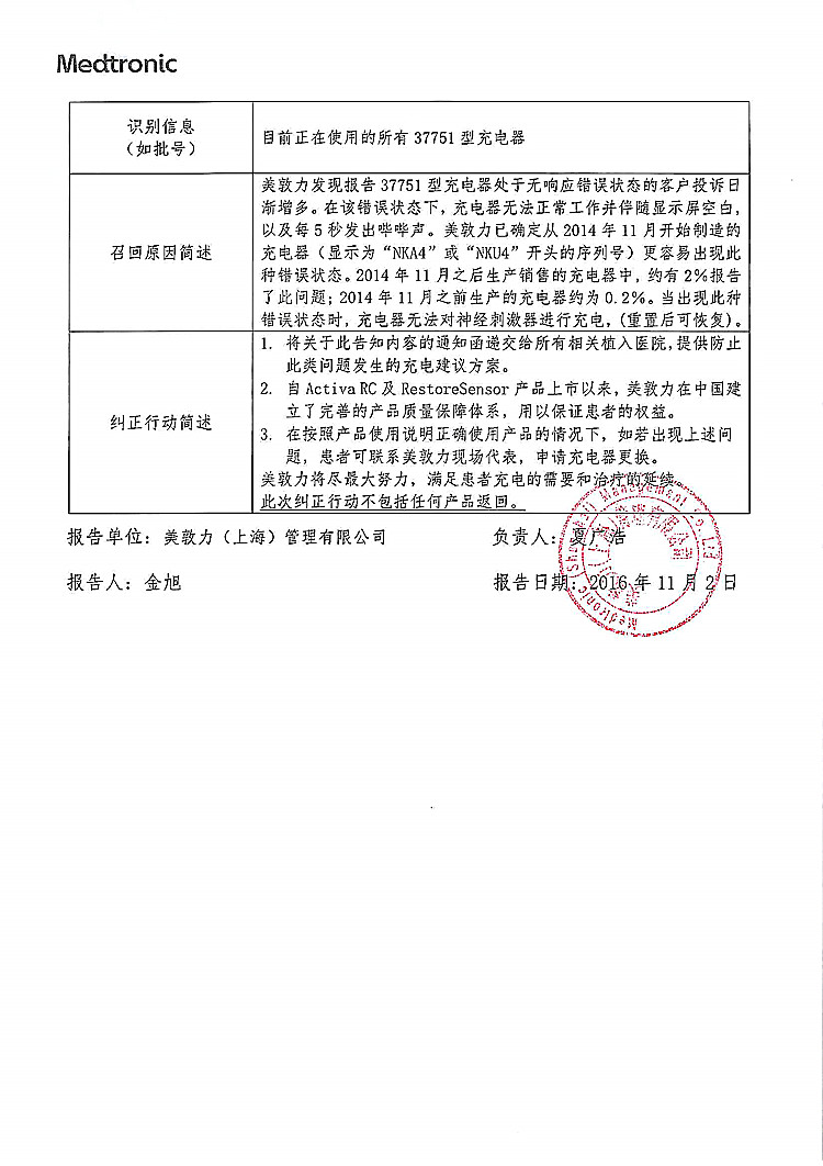 美敦力(上海)管理有限公司报告:公司发现涉及产品的37751型充电器处于无响应错误状态的客户投诉日渐增多,影响患者正常使用。公司决定召回相关产品,本次召回级别为Ⅱ级,涉及产品的型号、规格及批次等详细信息见《医疗器械召回事件报告表》。