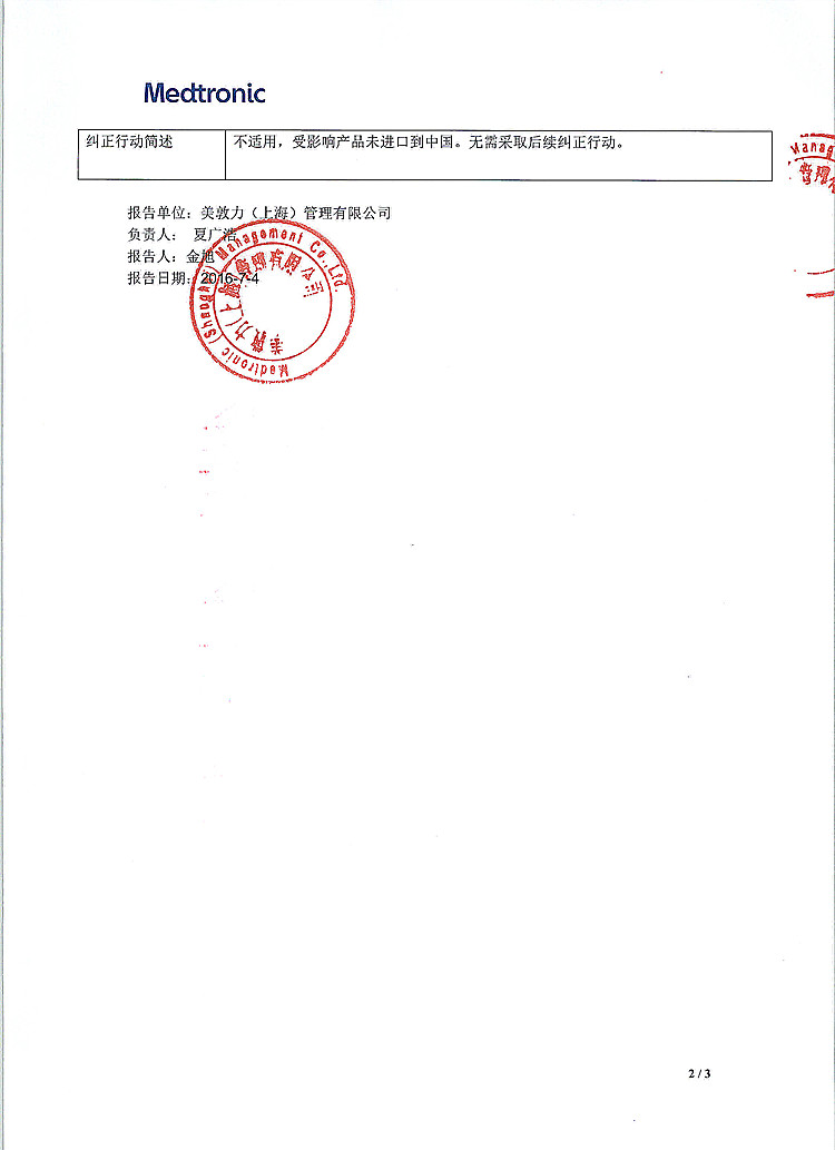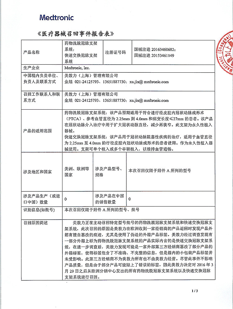美敦力(上海)管理有限公司报告,该公司代理的药物洗脱冠脉支架系统(注册证编号:国械注进20163460682)和快速交换冠脉支架系统(注册证编号:国械注进20153461149),由于部分产品可能贴上了错误的标签,其生产商Medtronic Inc.对该产品进行主动召回。该公司称本次召回产品未在中国销售。请各省、自治区、直辖市食品药品监督管理局加强对此类产品的监督管理。