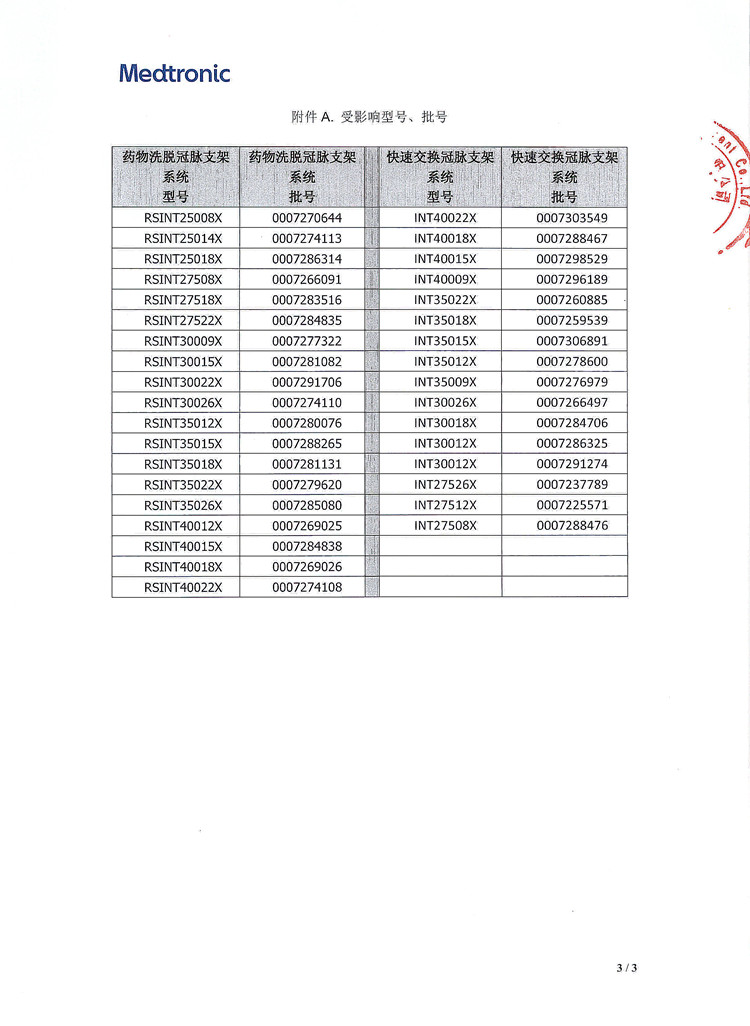 Medtronic Inc.对药物洗脱冠脉支架系统和快速交换冠脉支架系统进行召回