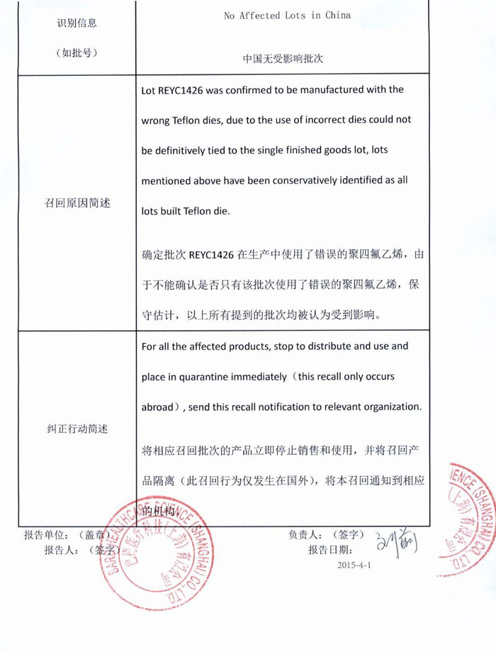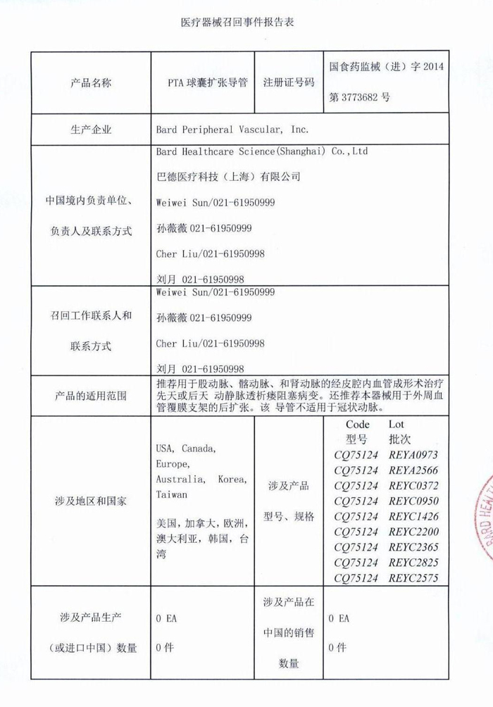 巴德医疗科技(上海)有限公司报告,该公司代理的PTA球囊扩张导管(商品名:CONQUEST) (注册证号:国食药监械(进)字2014第3773682号)由于在生产中使用了错误的聚四氟乙烯,其生产商美国Bard Peripheral Vascular,Inc.对该产品进行主动召回。该公司称本次召回产品未在中国销售。请各省、自治区、直辖市食品药品监督管理局加强对此类产品的监督管理。