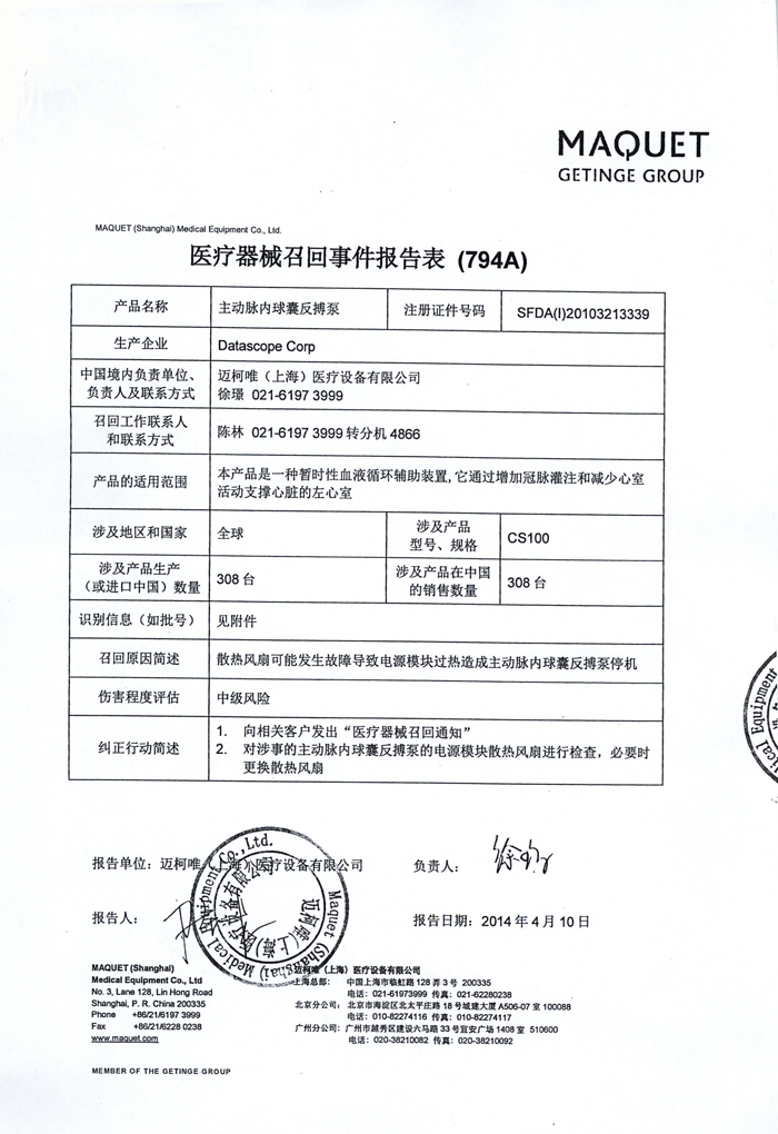 2014年5月7日上海市食品药品监督管理局报告,迈柯唯(上海)医疗设备有限公司代理的主动脉内球囊反搏泵(注册证号:国食药监械(进)字2010第3213339号)由于散热风扇可能发生故障导致电源模块过热造成主动脉内球囊反搏泵停机,其生产商美国Datascope Corp公司对该产品进行主动召回。请各省、自治区、直辖市食品药品监督管理局加强对此类产品的监督管理。(来源:国家食品药品监督管理总局网站)