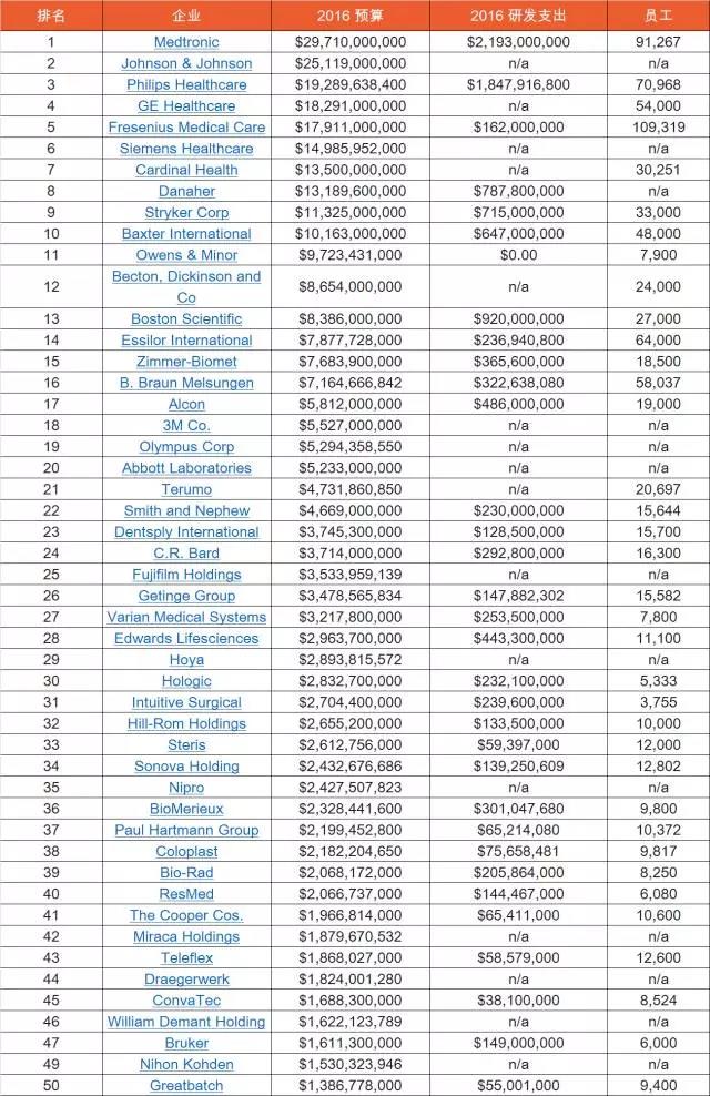 由于合并和收购,我们也能预测到2018年的医疗器械前百排名的一些变化,比如雅培以25万亿美元的价格完成了对圣犹达医疗公司的收购,同时在今年7月份康德乐公司以61亿美元购买了美敦力的病人护理、深静脉血栓症和营养不良的业务板块。