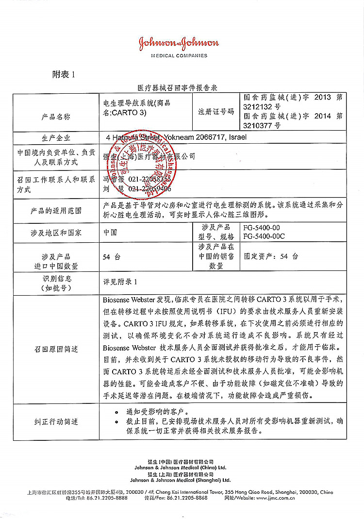 强生(上海)医疗器材有限公司对电生理导航系统主动召回
