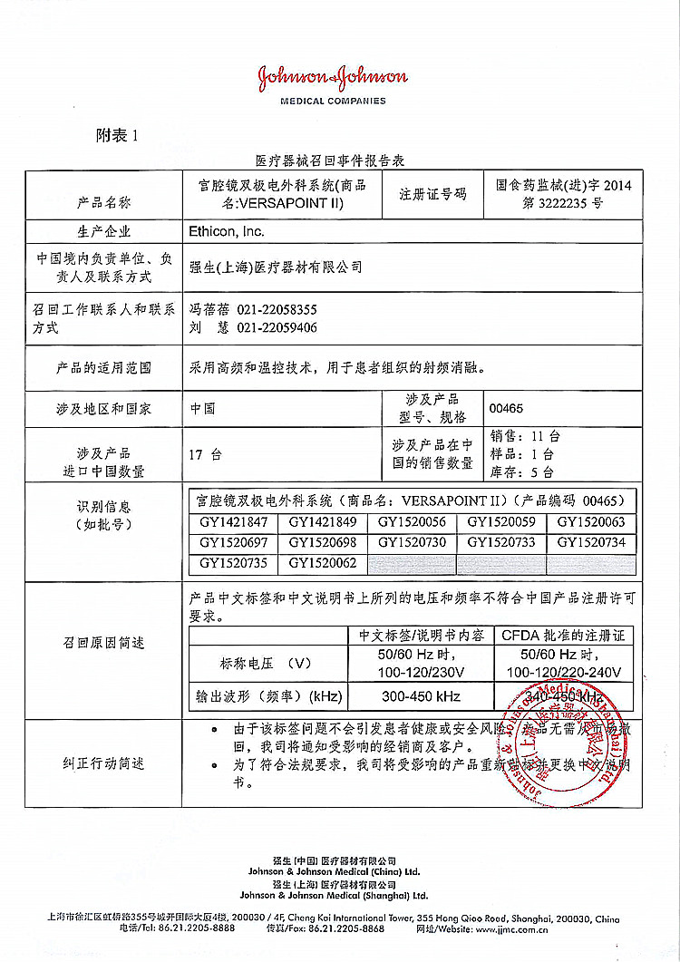 强生(上海)医疗器材有限公司报告:涉及产品的中文标签和中文说明书上所列的电压和频率不符合中国产品注册许可证要求。公司决定召回相关产品,本次召回级别III级,涉及产品的型号、规格及批次等详细信息见《医疗器械召回事件报告表》。