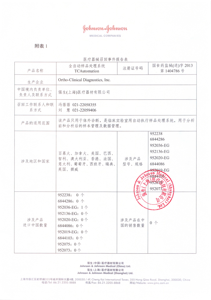 强生(上海)医疗器材有限公司对全自动样品处理系统主动召回