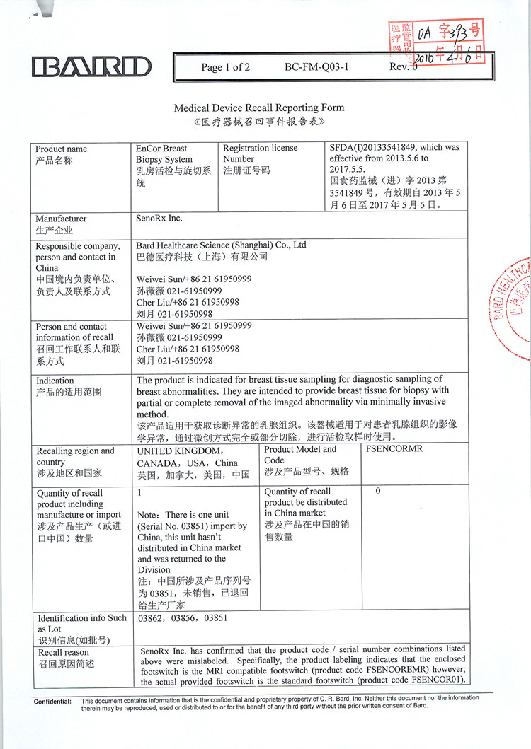 巴德医疗科技(上海)有限公司报告,该公司代理的乳房活检与旋切系统(注册证编号:国食药监械(进)字2013第3541849号),由于以上产品使用了错误的标签,其生产商SenoRx Inc.对该产品进行主动召回。该公司称本次召回产品未在中国销售。请各省、自治区、直辖市食品药品监督管理局加强对此类产品的监督管理。
