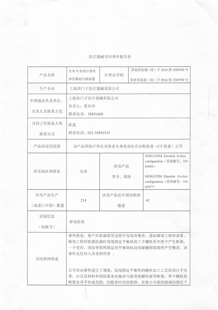 上海西门子医疗器械有限公司对全身X射线计算机体层螺旋扫描装置主动召回