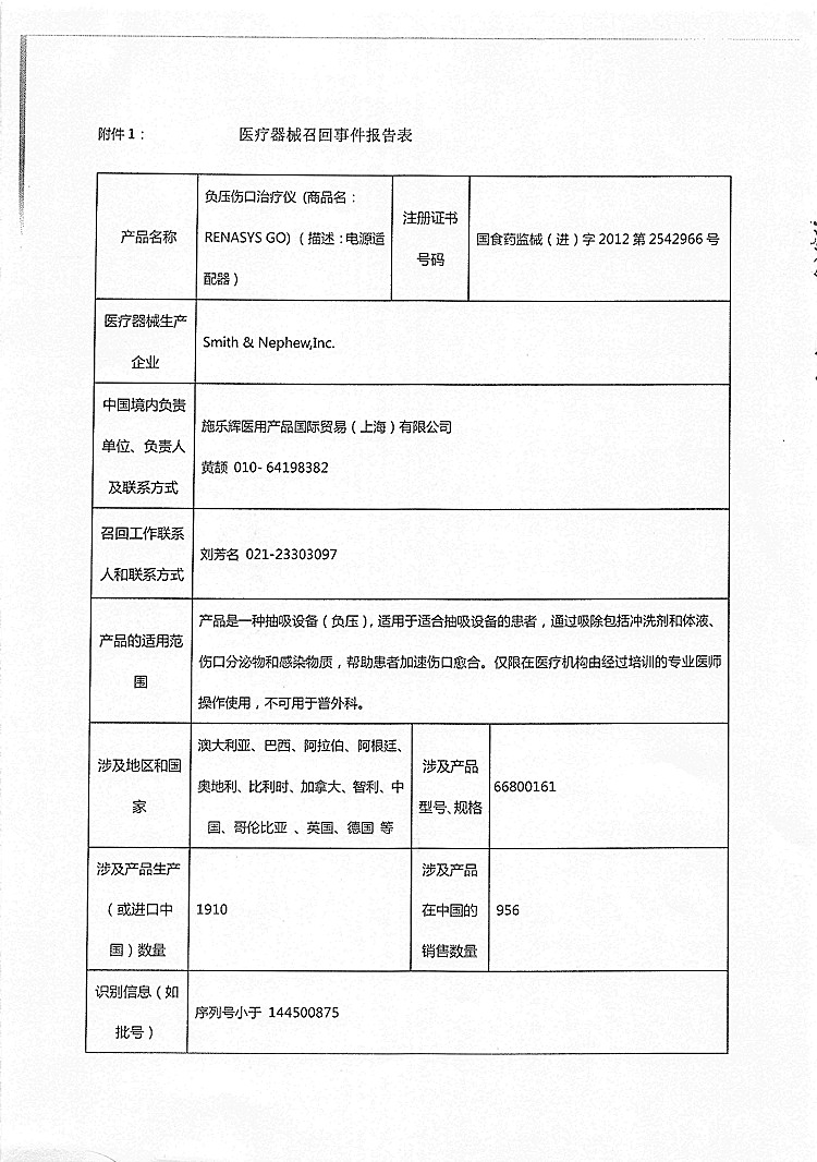 施乐辉医用产品国际贸易(上海)有限公司对负压伤口治疗仪主动召回