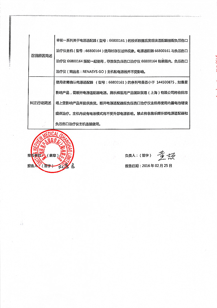 施乐辉医用产品国际贸易(上海)有限公司报告:审核一系列关于电源适配器(型号:66800161)的投诉数据后发现该适配器搭配负压伤口治疗仪主机(型号:66800164)使用时存在过热现象。公司决定召回相关产品,本次召回级别为Ⅱ级,涉及产品的型号、规格及批次等详细信息见《医疗器械召回事件报告表》。