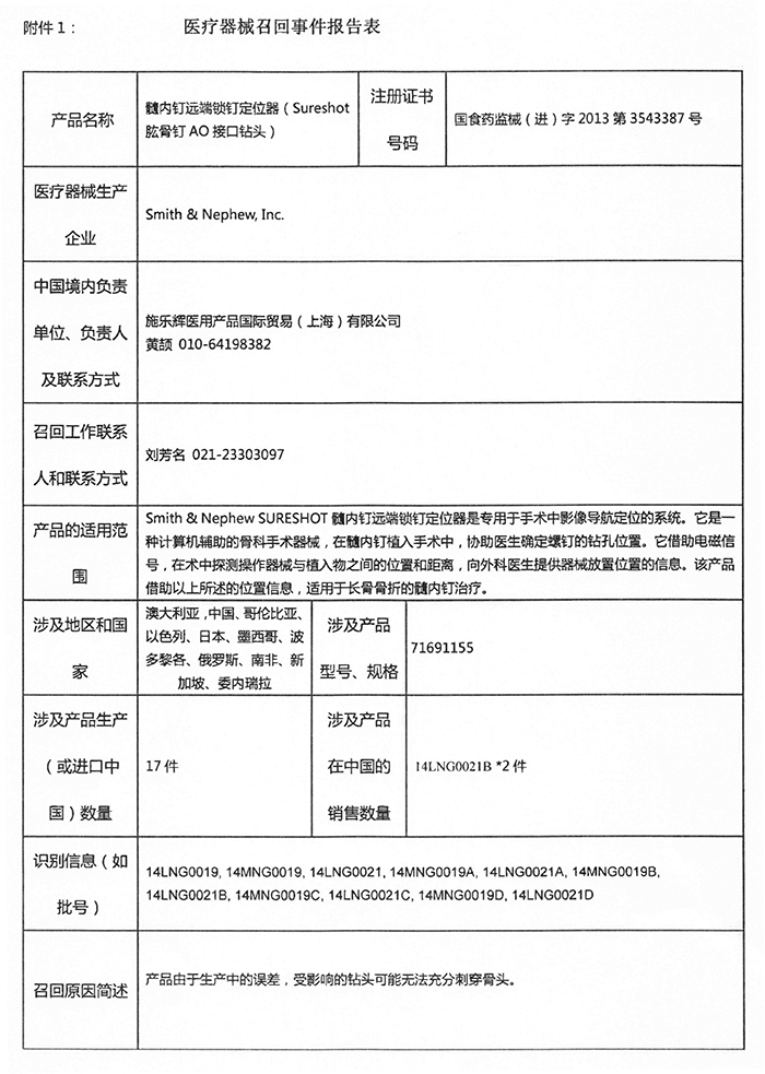 施乐辉医用产品国际贸易(上海)有限公司对髓内钉远端锁钉定位器主动召回