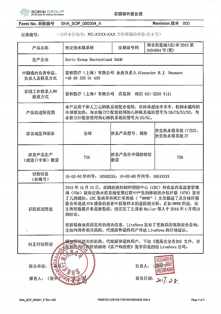 索林医疗(上海)有限公司报告:鉴于美国监管机构关于热交换水箱系统使用过程中产生肺结核分歧杆菌的通告。公司决定召回相关产品,向用户发放《现场安全告知》,本次召回级别II级,涉及产品的型号、规格及批次等详细信息见《医疗器械召回事件报告表》。