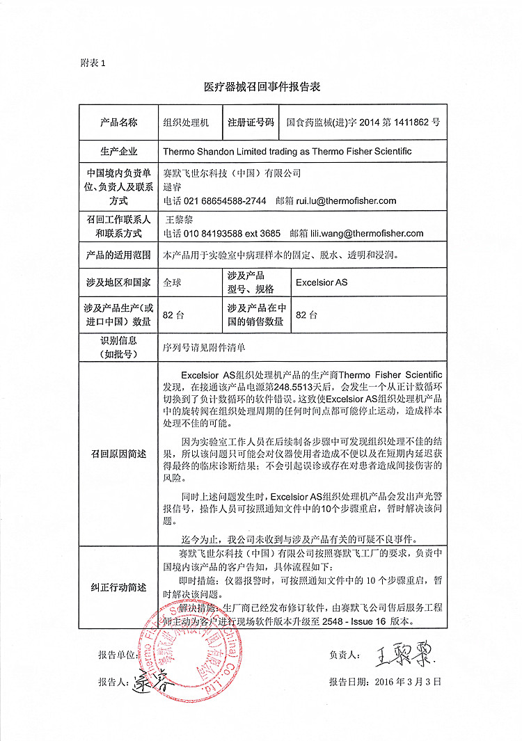 赛默飞世尔科技(中国)有限公司对组织处理机主动召回