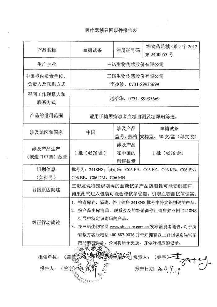 三诺生物传感股份有限公司报告,由于产品防潮性可能受到破坏等原因,三诺生物传感股份有限公司对其生产的血糖试条(注册号:湘食药监械(准)字2012第2400053号)主动召回。召回级别为三级。涉及产品的型号、规格及批次等详细信息见《医疗器械召回事件报告表》。(来源:国家食品药品监督管理总局网站)