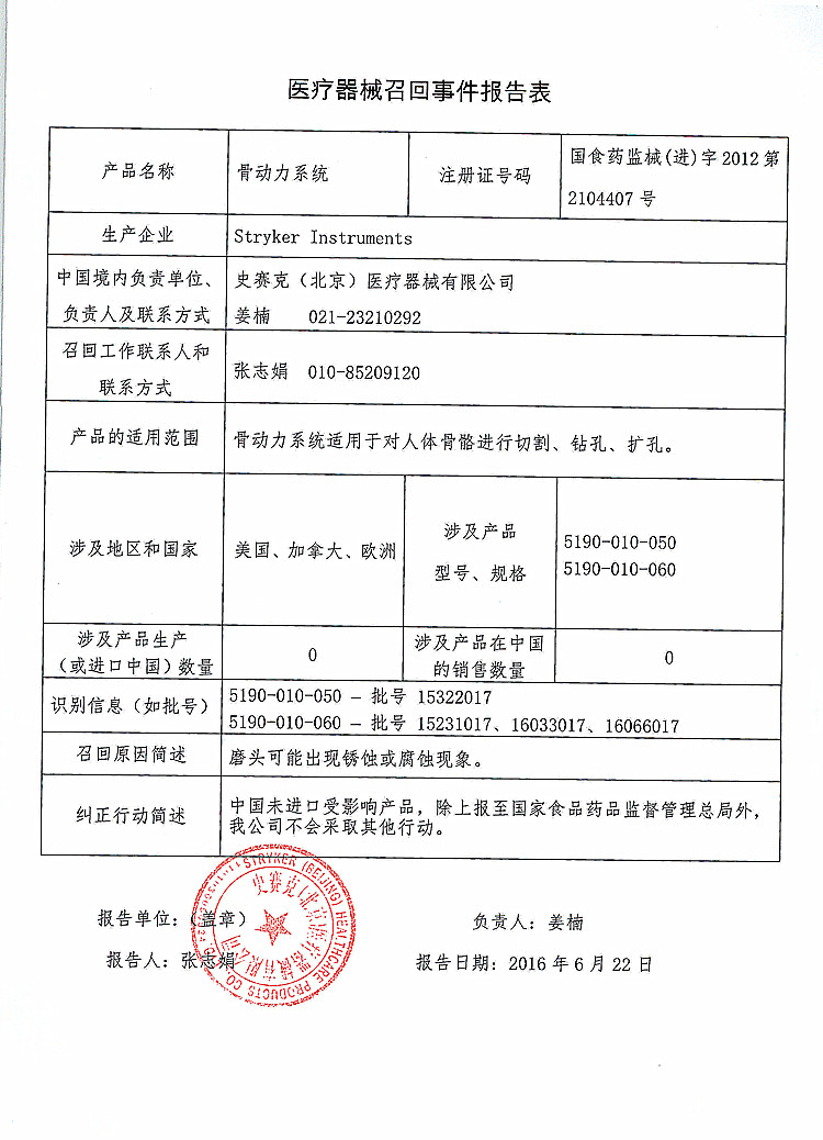 史赛克(北京)医疗器械有限公司报告,该公司代理的骨动力系统(注册证编号:国食药监械(进)字2012第2104407号),由于磨头可能出现锈蚀或腐蚀现象,其生产商Stryker Instruments对该产品进行主动召回。该公司称本次召回产品未在中国销售。请各省、自治区、直辖市食品药品监督管理局加强对此类产品的监督管理。