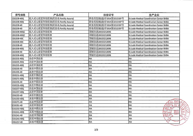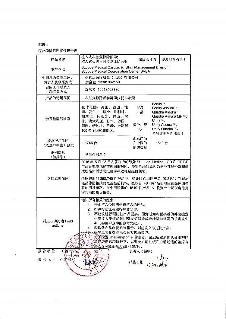 圣犹达医疗用品(上海)有限公司对植入式心脏复律除颤器、植入式心脏再同步复律除颤器主动召回