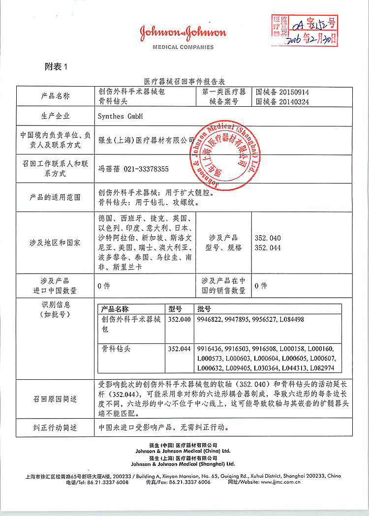 强生(上海)医疗器材有限公司报告,该公司代理的创伤外科手术器械包(备案号:国械备20150914)、骨科钻头(备案号:国械备20140324),发现受影响批次的创伤外科手术器械包的软轴(352.040)和骨科钻头的活动延长杆(352.044),可能采用非对称的六边形耦合器制成,导致六边形的每条边长度不同,六边形的中心不位于中心线上,这可能导致软轴与其嵌套的扩髓器头端不能匹配。其生产商Synthes GmbH对该产品进行主动召回,该公司称本次召回产品未在中国销售。请各省、自治区、直辖市食品药品监督管理局加强对此类产品的监督管理。