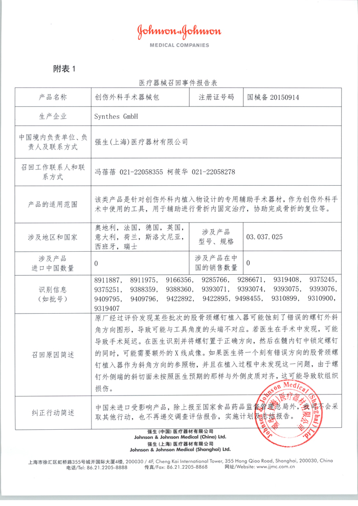 强生(上海)医疗器材有限公司报告,该公司代理的创伤外科手术器械包(备案号:国械备20150914),由于以上产品的股骨颈螺钉植入器可能蚀刻了错误的螺钉外斜角方向图形,其生产商Synthes GmbH对该产品进行主动召回。该公司称本次召回产品未在中国销售。请各省、自治区、直辖市食品药品监督管理局加强对此类产品的监督管理。