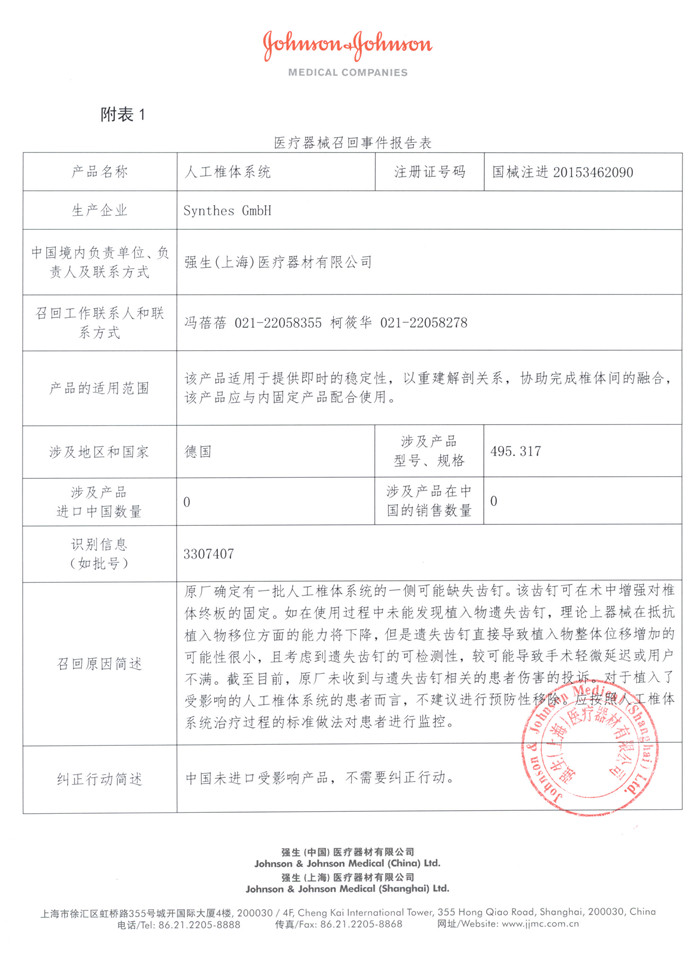 强生(上海)医疗器材有限公司报告,该公司代理的人工椎体系统(注册证编号:国械注进20153462090),由于以上产品的一侧可能缺失齿钉,其生产商Synthes GmbH对该产品进行主动召回。该公司称本次召回产品未在中国销售。请各省、自治区、直辖市食品药品监督管理局加强对此类产品的监督管理。