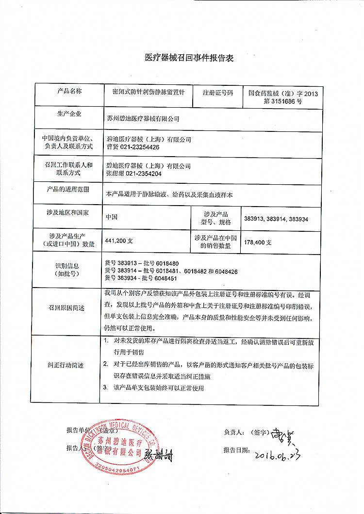 苏州碧迪医疗器械有限公司对密闭式防针刺伤静脉留置针主动召回