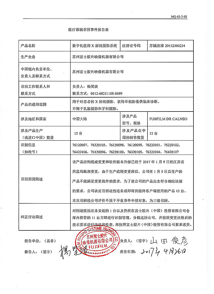 苏州富士胶片映像机器有限公司报告,由于未及时按照注册变更后的要求组织生产等原因,苏州富士胶片映像机器有限公司对其生产的数字化医用X射线摄影系统(注册号:苏械注准20152300234)进行主动召回。召回级别为三级。涉及产品的型号、规格及批次等详细信息见《医疗器械召回事件报告表》。
