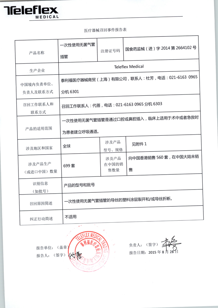 Teleflex Medical Sdn.Bhd对一次性使用无菌气管插管进行召回