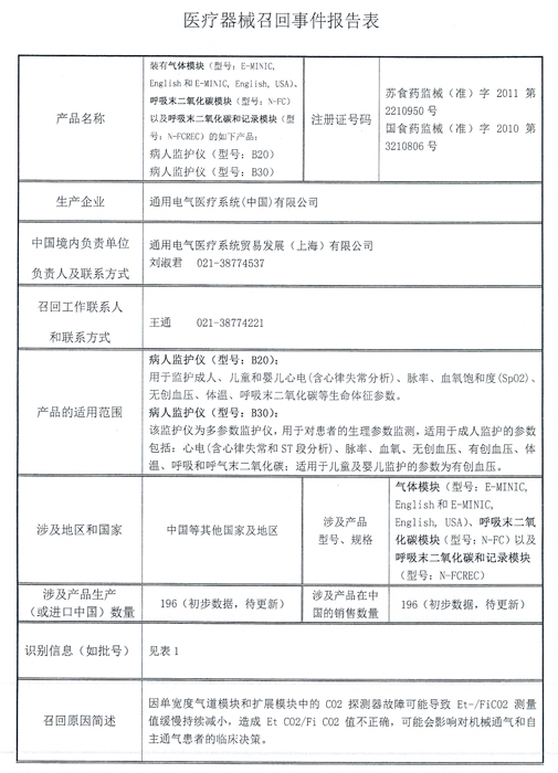 通用电气医疗系统(中国)有限公司报告,由于CO2探测器故障等原因,通用电气医疗系统(中国)有限公司对其生产的病人监护仪(注册或备案号: 苏食药监械(准)字2011第2210950号、国食药监械(准)字2010第3210806号)主动召回。召回级别为 一级。涉及产品的型号、规格及批次等详细信息见《医疗器械召回事件报告表》。(来源:江苏省食品药品监督管理局)
