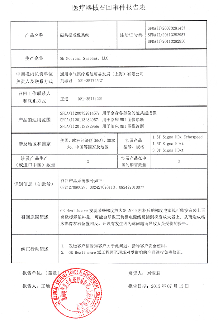 通用电气医疗系统贸易发展(上海)有限公司对磁共振成像系统主动召回