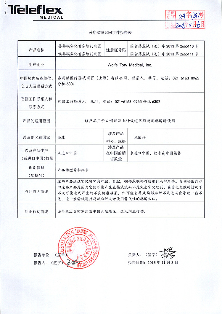 Wolfe Tory Medical, Inc.对对鼻粘膜雾化喷雾给药装置和喉粘膜雾化喷雾给药装置进行召回