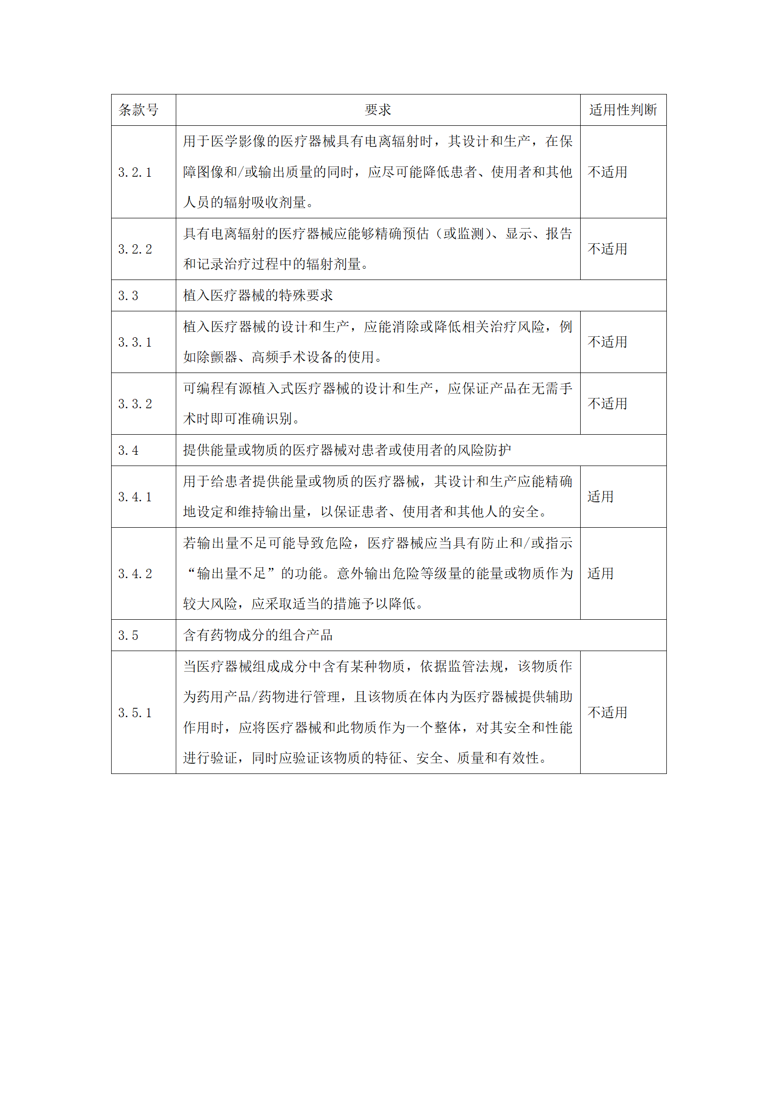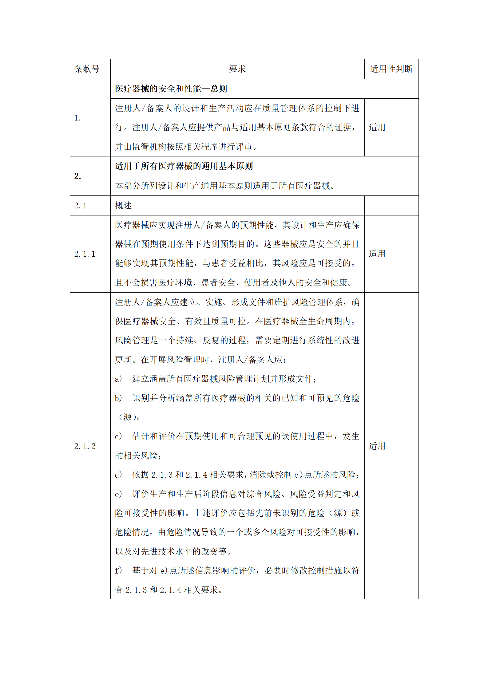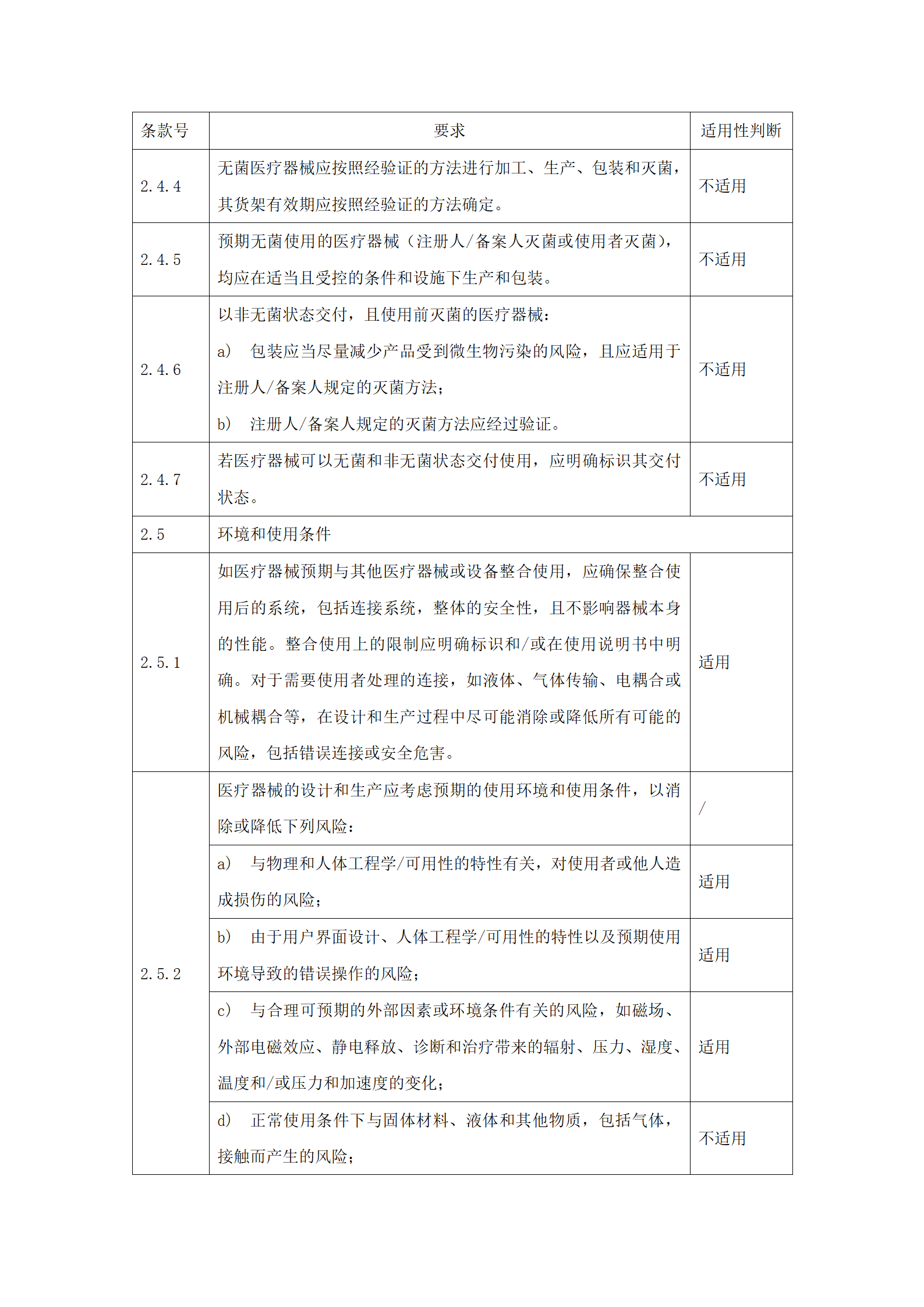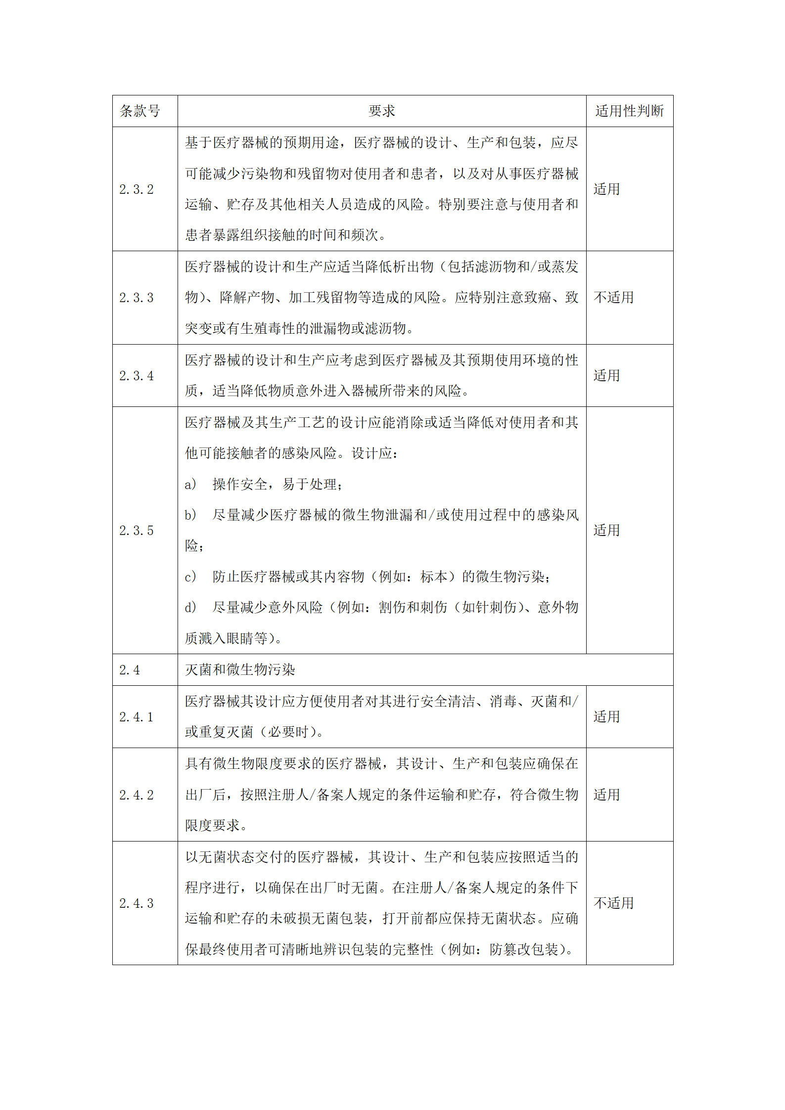 应明确申报产品对《医疗器械安全和性能的基本原则》(附件2)中各项要求的适用性。对于不适用的要求,应当逐项说明不适用的理由。对于适用要求,应逐项说明为符合要求所采用的方法,以及证明其符合性的文件。关于证明各项要求符合性的文件,如果包含在产品注册申报资料中,应当说明其在申报资料中的具体位置。对于未包含在产品注册申报资料中的文件,应当注明该证据文件名称及其在质量管理体系文件中的编号。