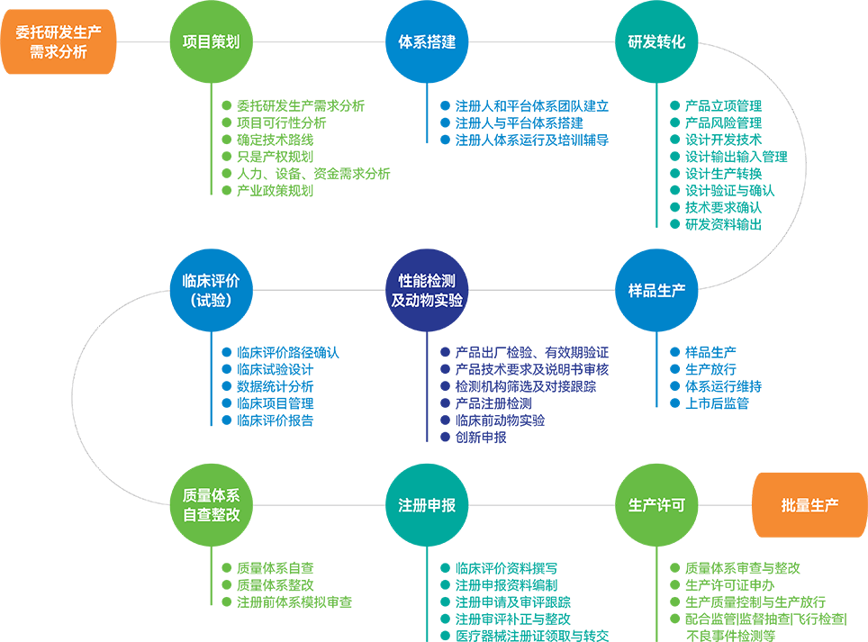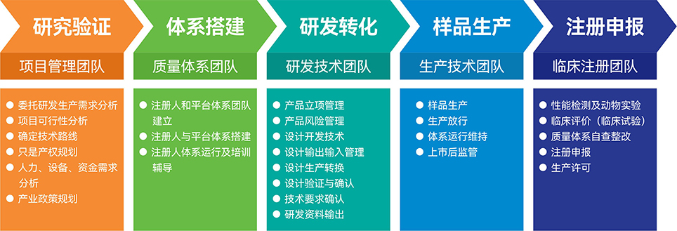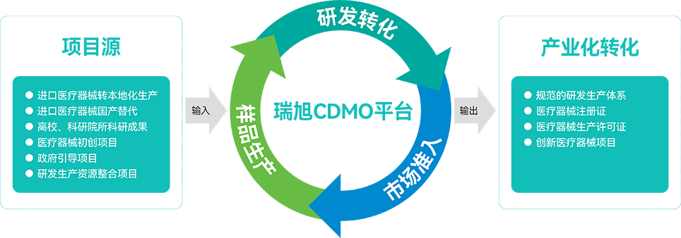瑞旭集团基于医疗器械注册人制度打造了合规的专业研发生产服务平台-瑞旭医疗器械产业转化CDMO平台,致力于为进口医疗器械国产化、科研成果产业转化、政府引导项目转化、研发生产资源整合项目及初创期器械项目提供法规咨询、技术转化、样品生产、检测验证、临床评价(试验)、质量体系及注册申报(认证)等全产业链技术服务。帮助创新医疗器械企业减少研发生产运营成本、缩短产品上市周期、提升项目转化成功率、提高产品注册通过率,高效推进医疗器械的产业化。