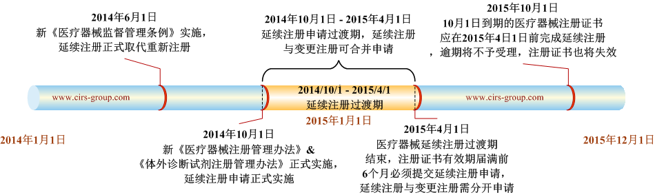 - 2014年10月1日: 新《医疗器械注册管理办法》和《体外诊断试剂注册管理办法》正式生效,延续注册正式开始实施;
