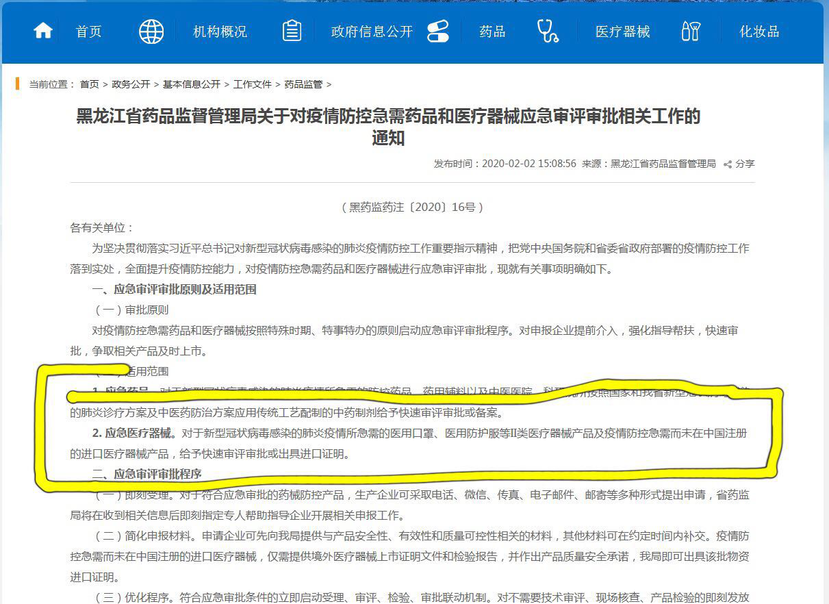 黑龙江省 | 用于疫情防控特殊审批的产品,批准证明文件在疫情结束后自动失效 |