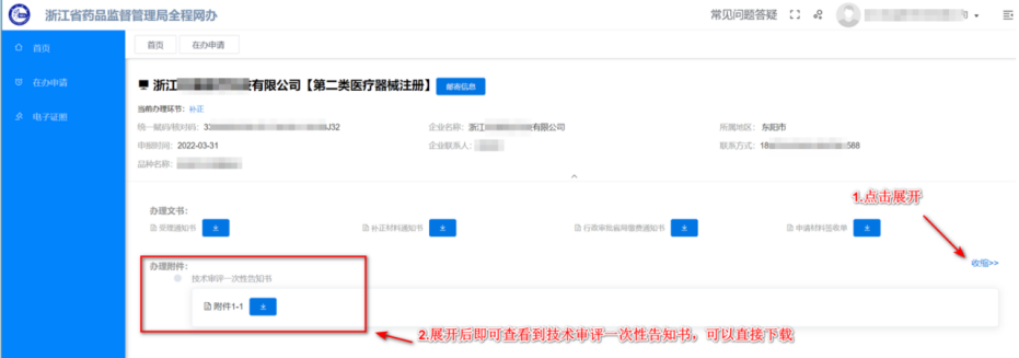 点击“查看”按钮进入办件详情页,在此界面就可查看/下载相应的受理通知书或者缴费通知书。