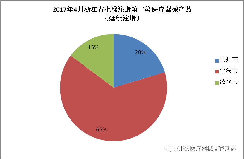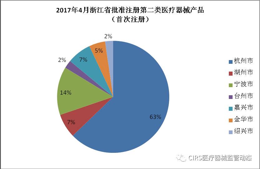 按照注册申请人所在辖区分析,首次批准注册的43个医疗器械产品中,杭州市27个,宁波市6个,湖州市3个,嘉兴市3个,金华市2个,绍兴市1个,台州市1个;批准延续注册的54个产品中,宁波市35个,杭州市11个,绍兴市8个。